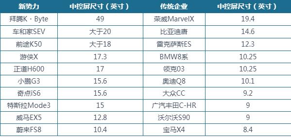 新勢力造車、傳統企業新車的中控屏尺寸統計