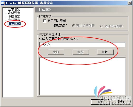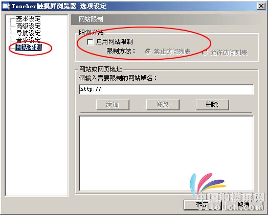 在Toucher觸摸屏瀏覽器網(wǎng)站限制設(shè)定中將設(shè)置選項(xiàng):
