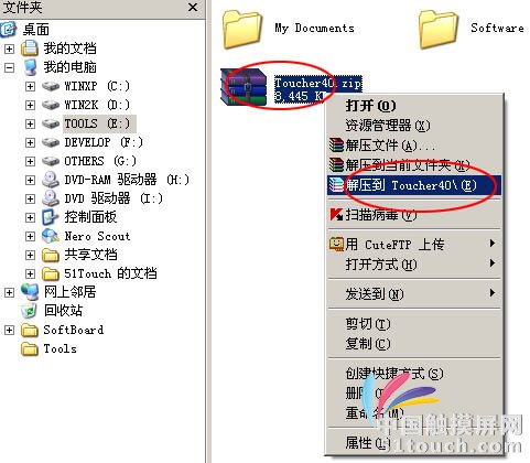 在下載的文件上點鼠標右鍵,選擇"解壓到Toucher40"即可,解壓完成后會得到一個叫 Toucher40 的文件夾